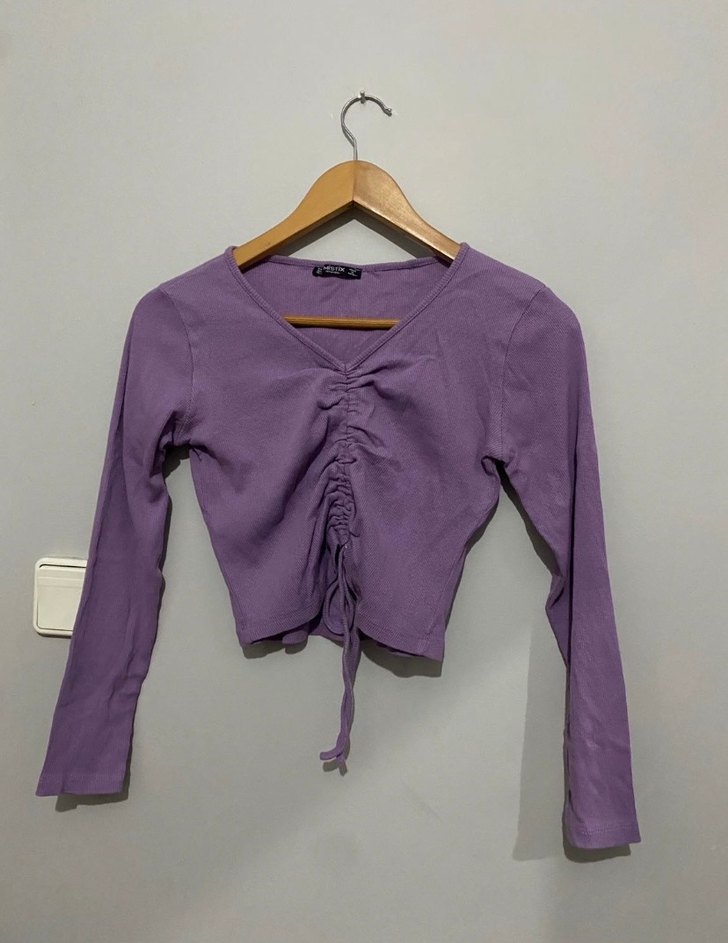 Uzun kollu, V yaka ve düğmeli detaylı mor bluz. Yumuşak keten kumaştan, minimal ve trend sokak stili, günlük kullanıma uygun midi boy ve desensiz.