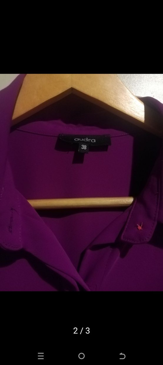 Düğmeli, uzun kollu, V yakalı ve ince kesim mor kadın gömleği. İpeksi dokusu ve parlak baskılı deseniyle iş ve sokak stiline uygundur. Marka: Audra, beden: 38.