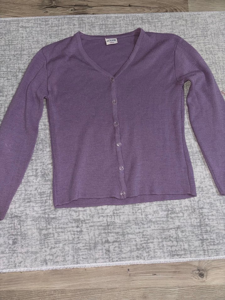 Mor renkli, uzun kollu, V yaka ve düğmeli triko hırka. Rahat ve bol kesimiyle günlük kullanıma uygundur.