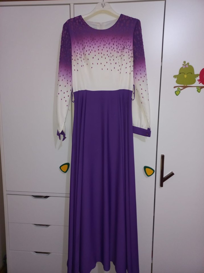 Bu uzun elbise, açık mor ve beyaz bağlama deseniyle drapeli, bol kesimdir. Uzun kollu ve yuvarlak yakalı, yumuşak sentetik kumaştan yapılmıştır, düğünler için uygundur.