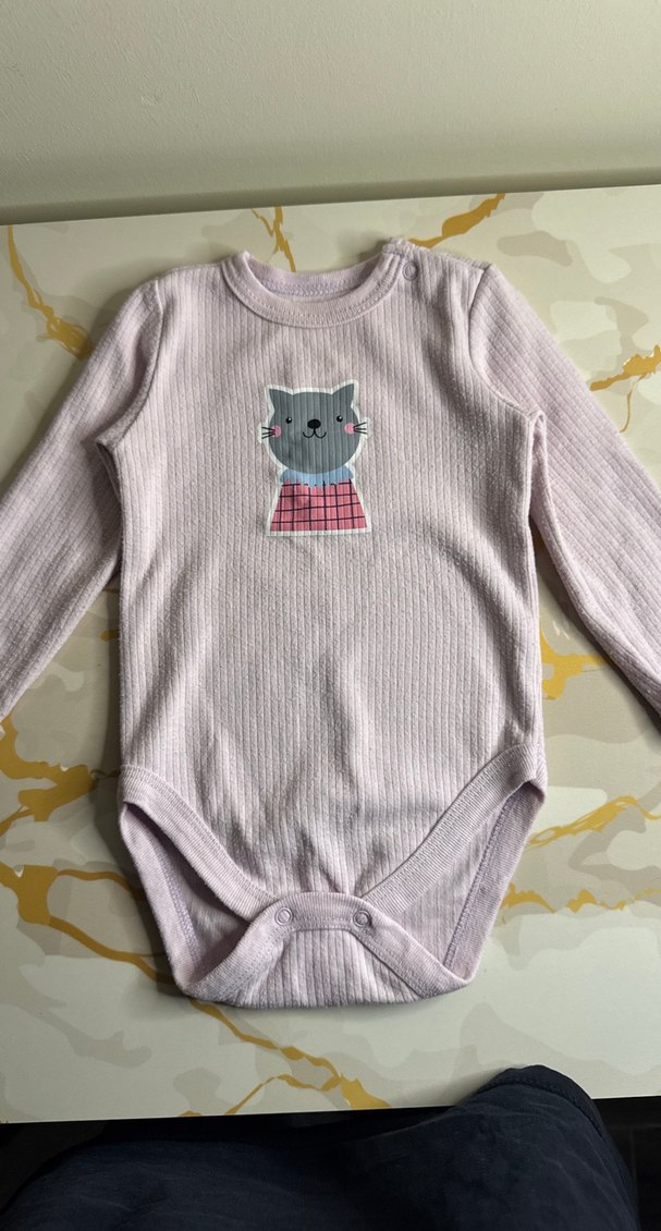 Pastel lila renkte, uzun kollu, triko dokulu ve önünde nakışlı kedi deseni olan bebek kız body. Yumuşak ve rahat kumaşlıdır.