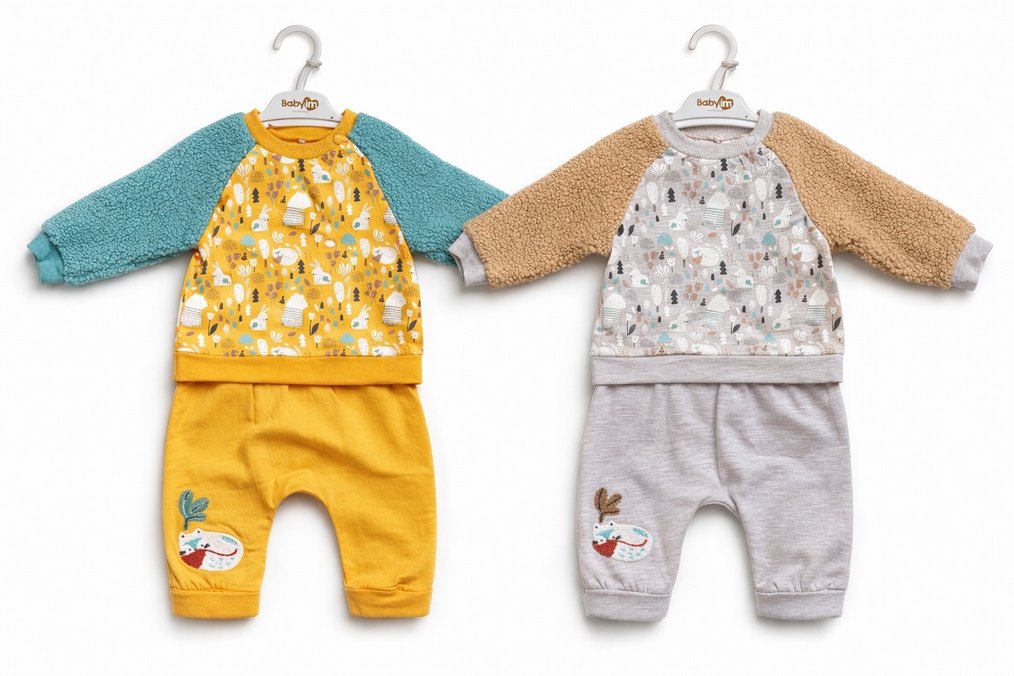 Renkli, uzun kollu, bisiklet yakalı bebek takımı. Pamuklu, örme dokulu ve nakışlı desenlere sahip, gri ve sarı renk seçenekleriyle.