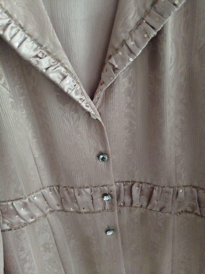 Düğmeli, uzun kollu ve nakışlı . Bej, parlak ve ipeksi kumaştan, vintage bohem tarzında, ofis için uygun.52 beden parlak kumaş 3 lü takım marka temsili