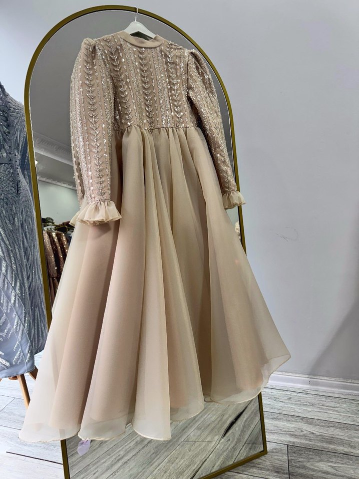 Uzun Kollu Nakışlı Bej Abiye Elbise