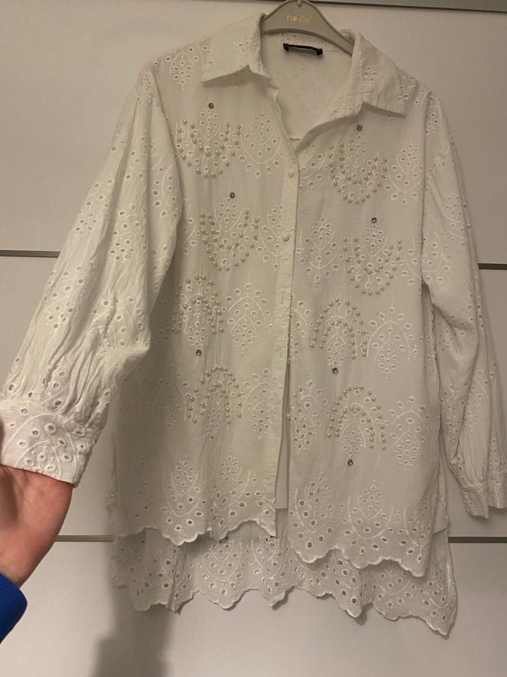 Nakışlı desenlere sahip, düğmeli ve V yaka uzun kollu beyaz keten gömlek. Bohem stil için bol kesim ve fırfırlı etek ucu içerir.