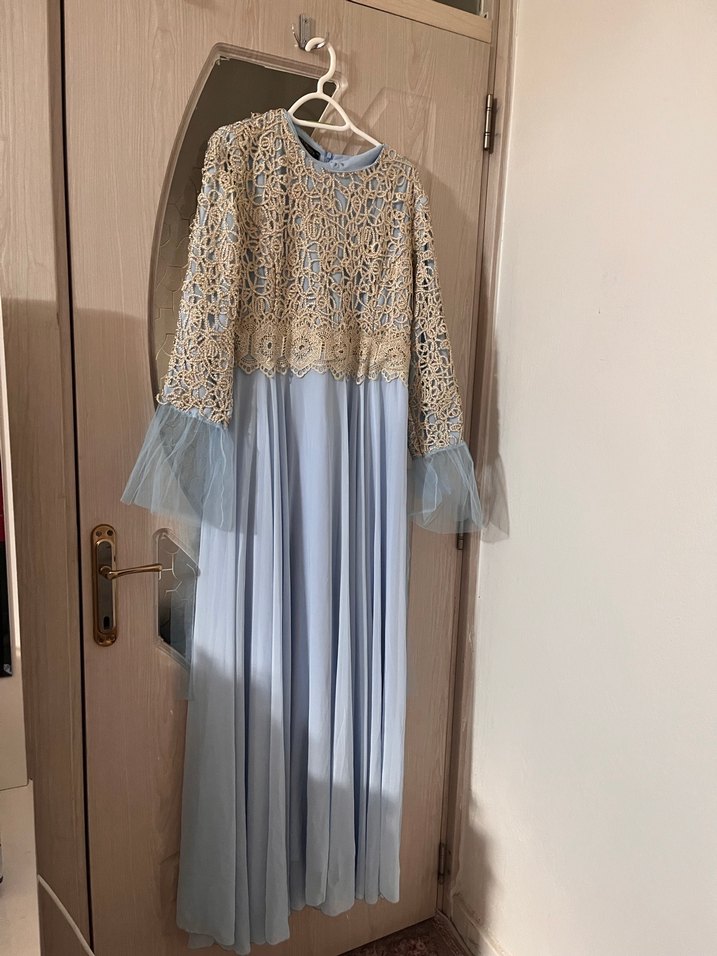 Uzun, bol kesim elbise nakışlı ve drapeli detaylara sahiptir. Uzun kollu, tül manşetli ve straplez yakalıdır. Bej ve açık mavi renklerle vintage, mütevazı bohem tarzı sunar.
