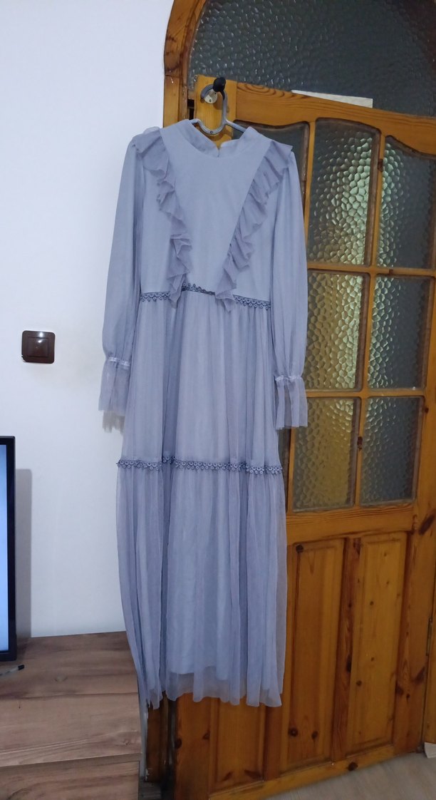 Uzun, bol kesim bohem elbise; yüksek yaka ve fırfırlı detaylara sahiptir. Sentetik kumaştan üretilmiş nakışlı desenlerle, düğünler için uygun.