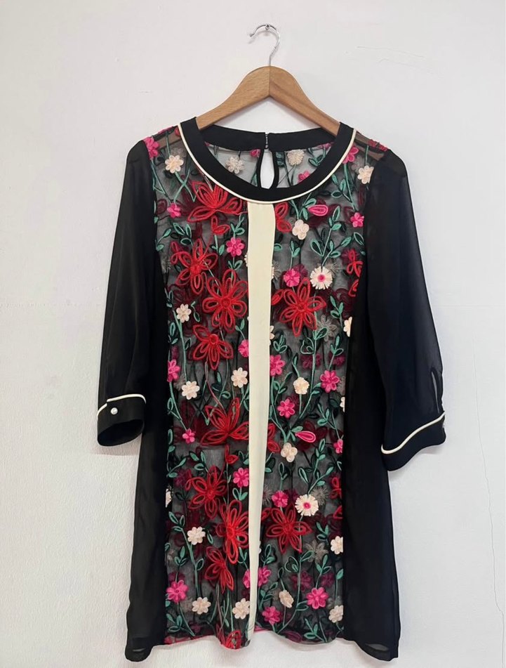 Uzun kollu, bol kesim hamile bluzu, nakışlı çiçek desenleri ve dantel detaylara sahiptir. Koyu çok renkli, yuvarlak yakalı, ofis için uygundur. Özel dikim hiç giyilmedi