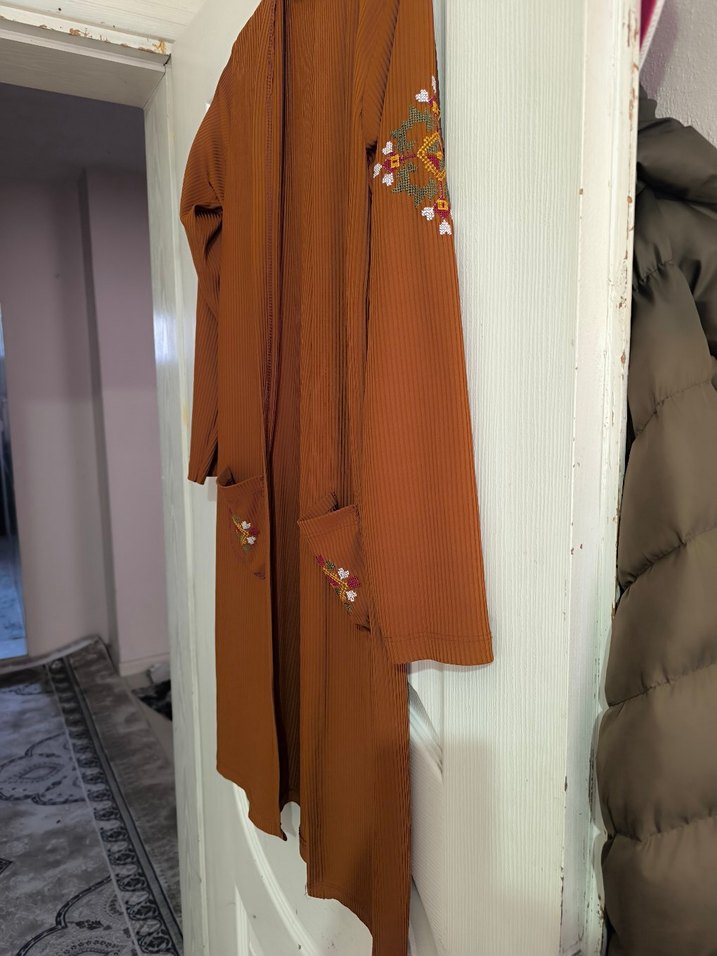 Uzun kollu, nakışlı desenlere sahip kahverengi tekstil kimono. Bol kesim ve drapeli, günlük kullanıma uygun bohem tarz.