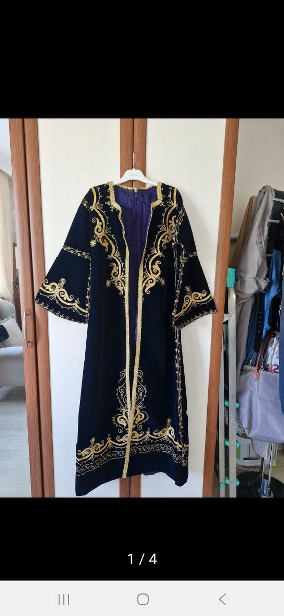 Uzun, bol kesim koyu renkli bu hint elbisesi, detaylı altın nakışlarla süslenmiştir. Notlu yaka ve drapeli uzun kollara sahiptir, bohem tarzı düğünler için uygundur. ✨