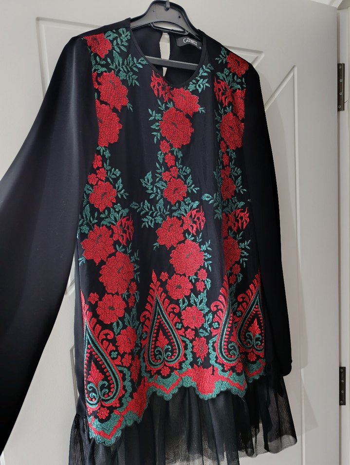Bu uzun kollu bohem tunik, koyu kırmızı nakışlarla süslenmiş bol kesim bir kumaştan yapılmıştır. Yuvarlak yakalı ve fırfır detaylıdır, günlük kullanım için uygundur.