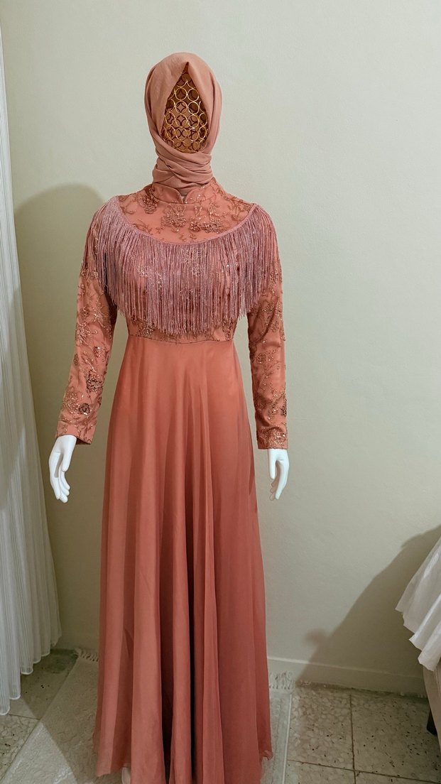 Somon renkte, uzun kollu ve nakışlı detaylara sahip, yüksek yakalı, salaş kesim bohem tarzda abiye elbise. Püsküllü drapeli detay içerir, düğün için uygundur. Şal dahildir