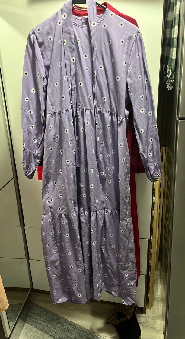 Uzun kollu, yüksek yakalı, nakışlı ve fırfırlı bohem tarzda, bol kesim uzun elbise. Günlük kullanıma uygun mor renkte.