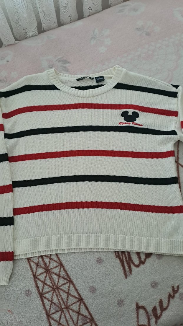 Uzun kollu, bisiklet yaka, bol kesim beyaz triko kazak. Kırmızı ve siyah çizgilerle süslenmiş, nakışlı Mickey Mouse detayına sahip rahat bir sokak stili ürünü.
