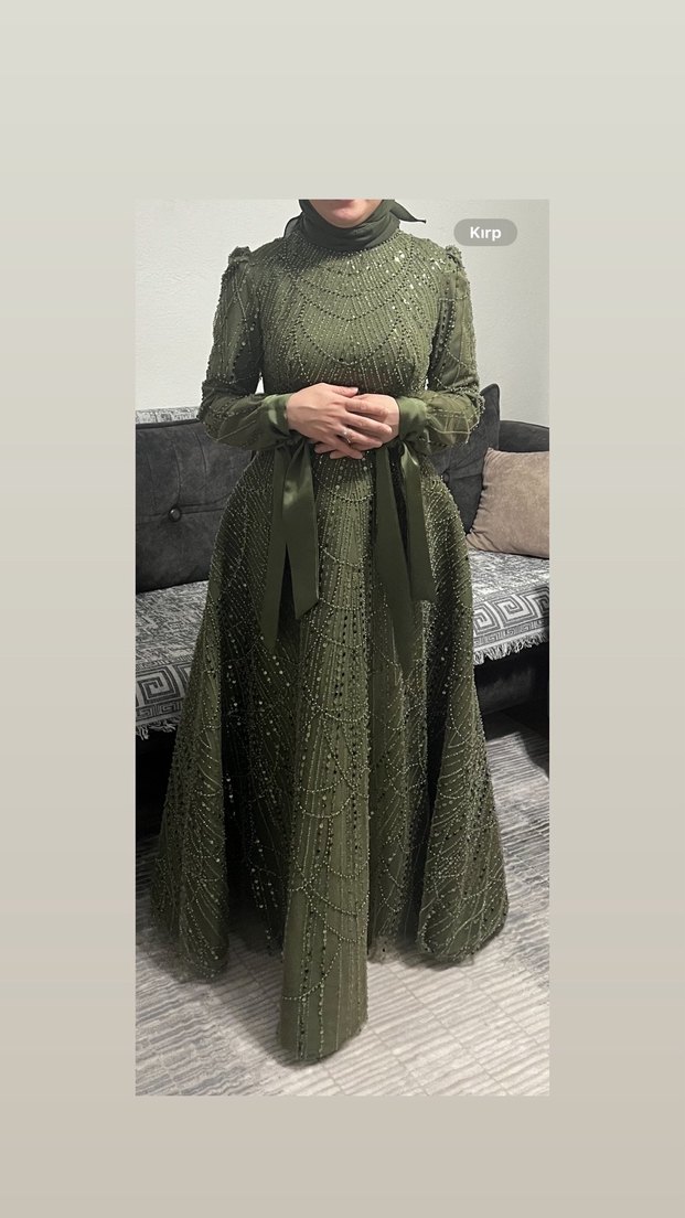 Uzun kollu, yüksek yakalı, drapeli ve nakışlı bu haki bindallı elbise, şık ve gösterişli bir tasarıma sahiptir.