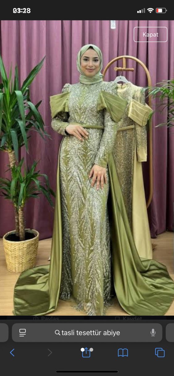 Bu uzun abiye elbise, parlak haki renkte nakışlı desenlere ve drapeli uzun kollara sahiptir. Straplez yakalı, mütevazı ve regular fit kesimdir.