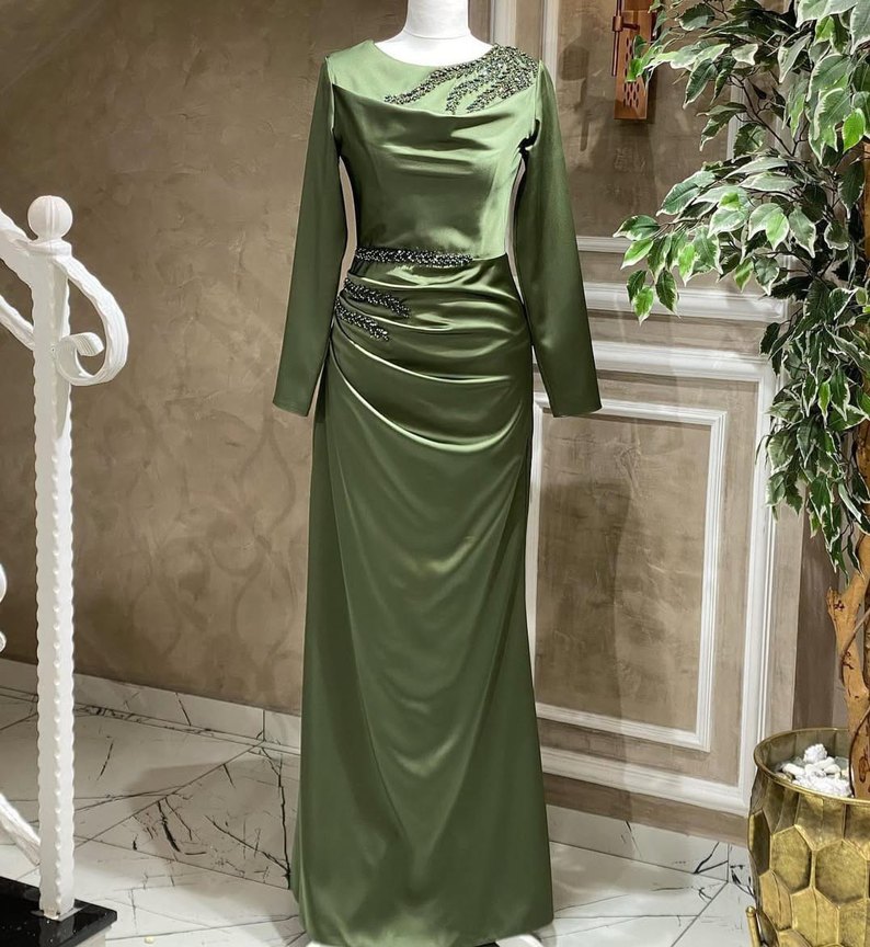 Parlak haki renkte, uzun kollu ve tekne yaka, nakışlı detaylarla süslenmiş uzun abiye elbise. Drapeli ve klasik modern kesimiyle düğünler için ideal, rahat bir fit sunar.