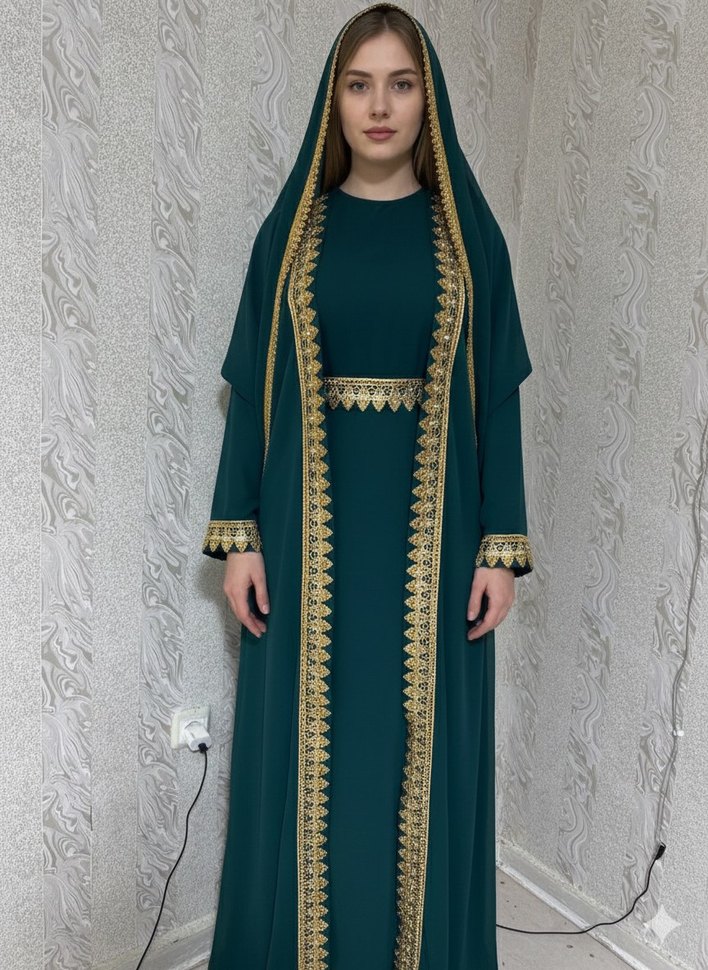 Uzun kollu, yuvarlak yakalı koyu yeşil kadın elbisesi, dökümlü tasarım ve altın işlemeli detaylarla sade ve bohem tarzda. Sentetik kumaştan, regular fit.