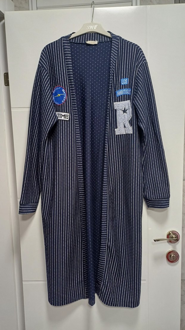 Uzun kollu cepli penye ceket. Lacivert renkli beyaz renk şeritlerden oluşan bu ceket şık ve günlük kullanım için uygundur. Boyu uzundur diz altına gelmektedir.
