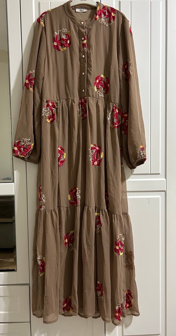 Kahverengi bohem uzun elbise, nakışlı çiçek desenleri ve fırfır detaylara sahiptir. Yüksek yakalı, uzun kollu ve bol kesimdir.