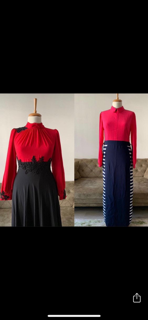 Uzun kollu, yüksek yakalı kadın elbisesi, pileli detaylar ve nakışlı desenlere sahiptir. Regular fit ve sentetik kumaştan üretilmiştir, biri kırmızı siyah diğeri fuşya ve lacivert renklidir. Kırmızıyı birkaç kez giydim kusuru yoktur. Diğeri de sıfırdır etiketlidir.