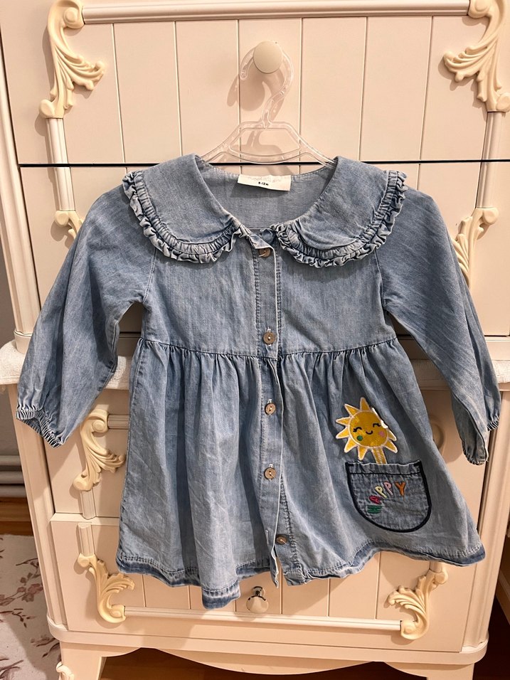 Bu bol kesim kız kot elbise, uzun kollu, fırfırlı yakalı, düğmeli ve güneş ile cep nakışlı detaylara sahiptir.