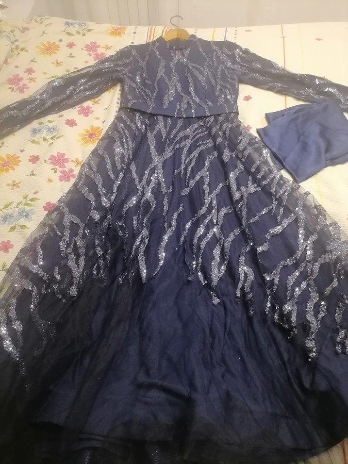 Uzun Kollu Nakışlı Lacivert Abiye Elbise bir kez giyindi