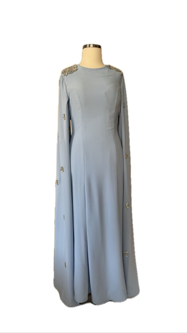 Uzun kollu, bisiklet yaka ve nakış detaylı mavi abiye elbise. Drapeli ve normal kesimiyle düğünler ve şık etkinlikler için uygundur. ✨