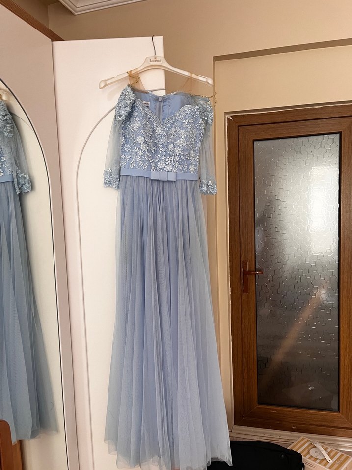 Uzun Kollu Nakışlı Mavi Nişan Elbisesi