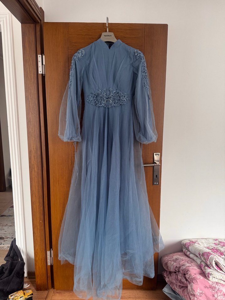 Uzun kollu, V yakalı ve nakış detaylı mavi, vintage esintili bohem tarzda, düğünlere uygun oturmalı uzun elbise.