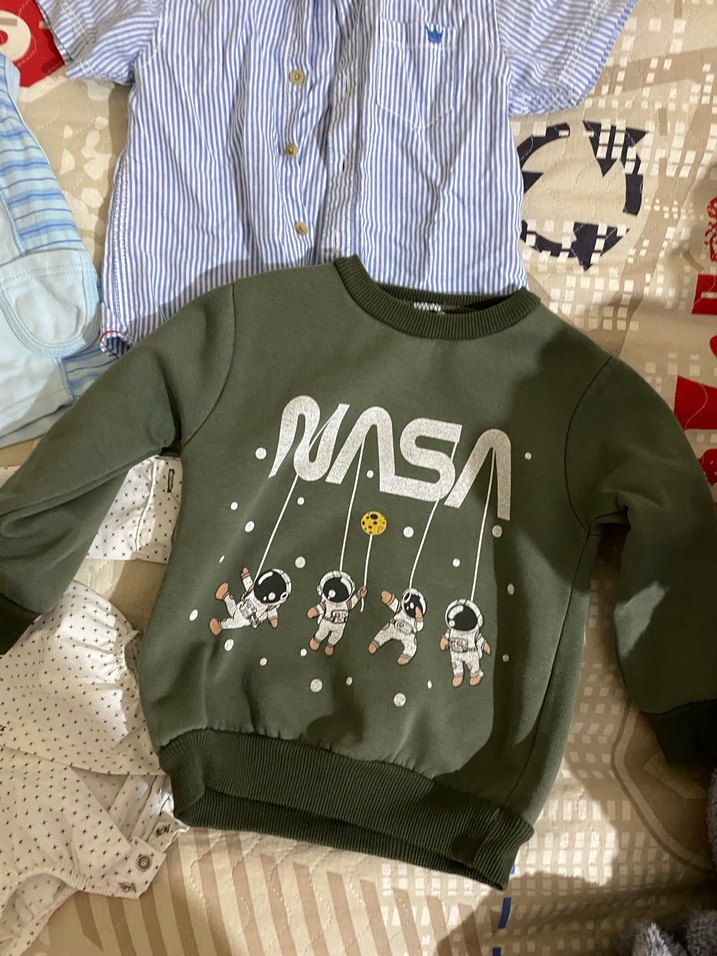 Koyu yeşil renkli, uzun kollu ve bol kesim erkek sweatshirt. Yumuşak ve örme dokulu kumaştan, NASA baskılı ve astronot figürlü. Sokak stiline uygun. 2 3 4 yaş uyumlu toplu fiyattır hepsi 120 tl