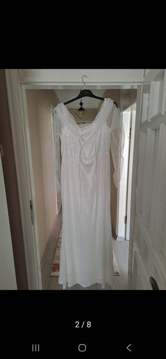 Bu uzun beyaz nikah elbisesi.XL 42 bedendir.beyaz pullu astarlı,yurtdışından alınmadır.sadece saatlik giyilmiştir Vintage ve bohem tarzı, hafif ışıltılarla trend belirleyici için uygundur.