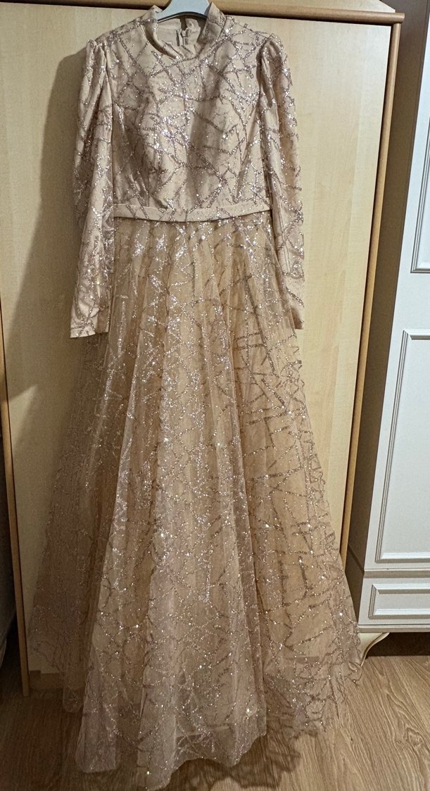 Bir kere giyildi ama hiç bir lekesi yok. Bej renkli, işlemeli ve parlak kumaştan yapılmış, uzun kollu, kayık yaka nişan elbisesi. Drapeli detayları ve klasik, zarif kesimiyle öne çıkar.