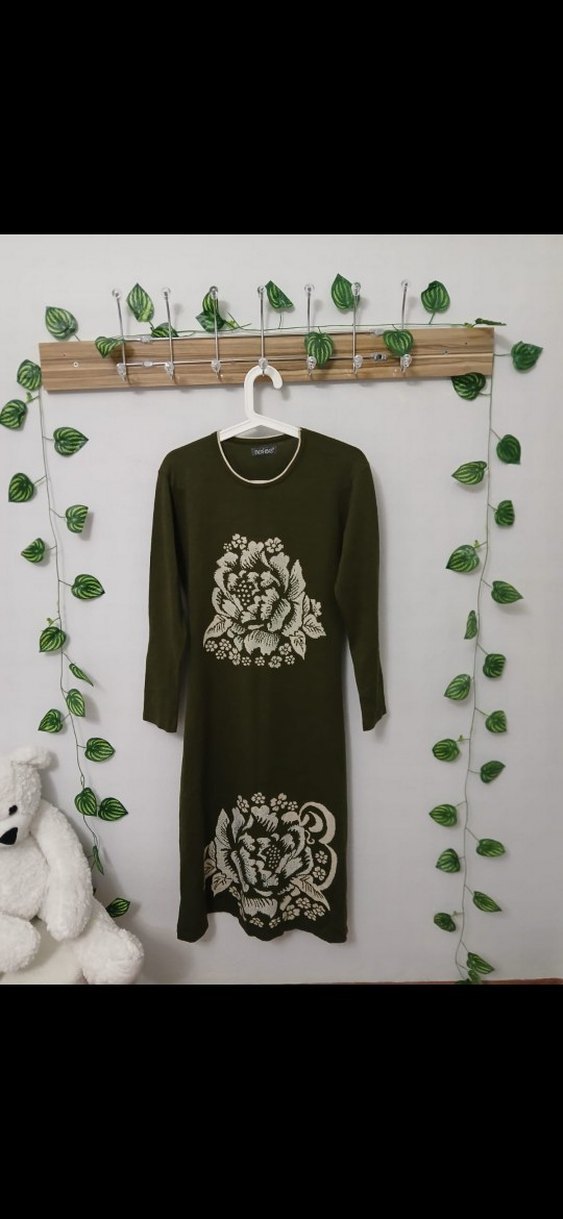 Uzun kollu, bol kesim triko elbise, koyu haki renkte çiçek baskılı. Bisiklet yaka ve örgü dokusu ile rahat ve bohem tarzda. Uzun triko tunik esneme payı vardır 38 40 uyumludur Uzunluk 128 Genişlik 47 cm