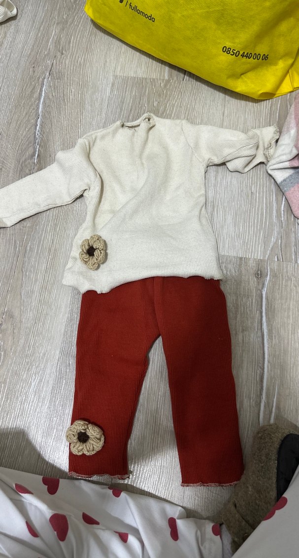 Örgü, uzun kollu beyaz üst ve kiremit rengi pantolon içeren bebek kız takımı. Her iki parçada küçük çiçek detayları bulunur. Görselde görünen leke var çıkabilecek lekedir
