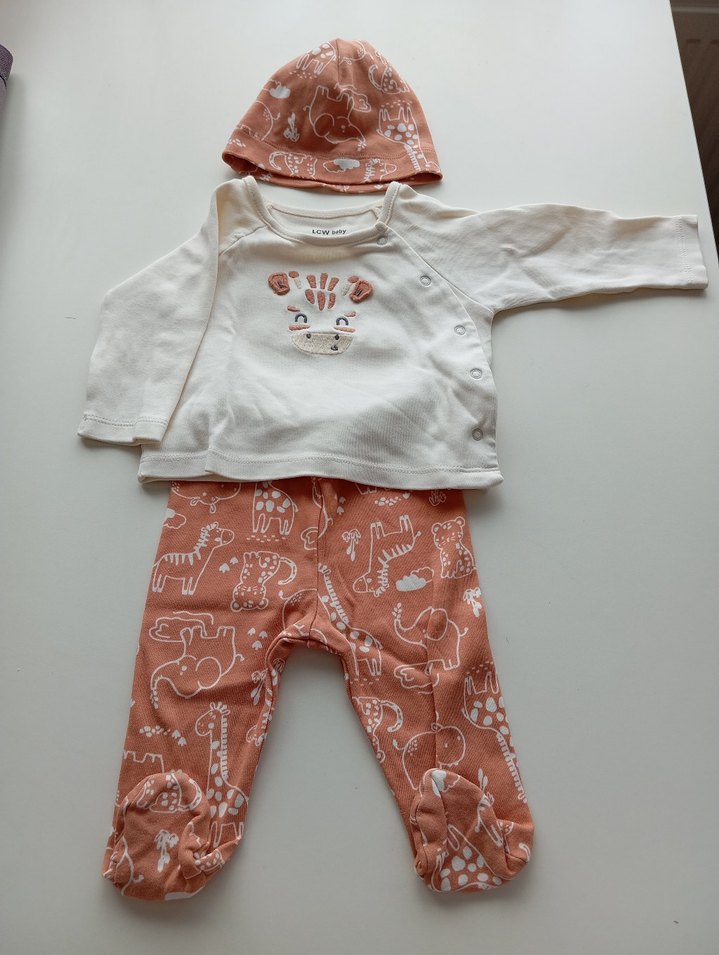 Uzun kollu, örgü dokulu bebek takımı. Pastel beyaz üstü sevimli hayvan baskılı, pastel desenli pantolon ve uyumlu şapka ile tamamlanmıştır.