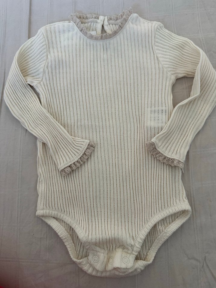 Uzun kollu, örgü beyaz bebek body, yakada ve kollarda narin fırfır detayları içerir. Yumuşak ve rahat bir kullanım sağlar.