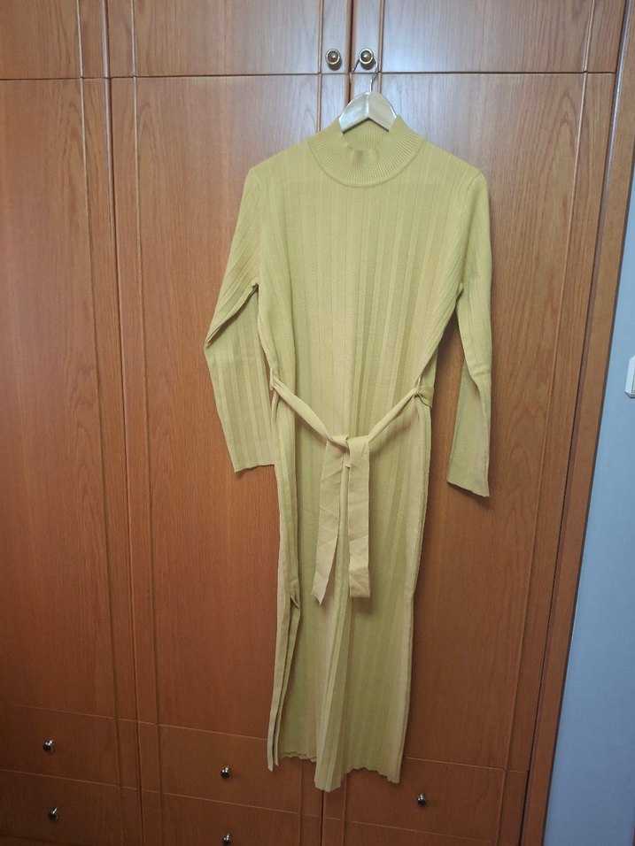uzun kollu ve boğazlı uzun elbise. Pilili tasarıma ve beli bağlamalı detaylara sahiptir, günlük kullanıma uygundur. örgu elbise kenarlari yirtmacli