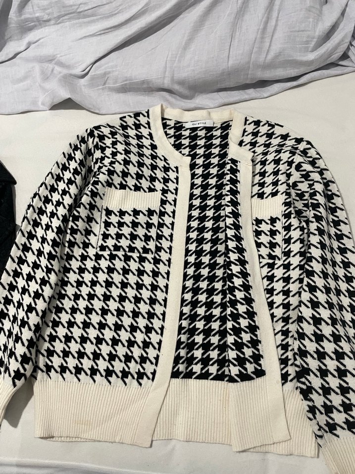 Fitted kesim, uzun kollu ve yakalı bu örgü hırka, beyaz ve gri renklerde klasik desenle günlük sokak stiline uygun midi boydadır.