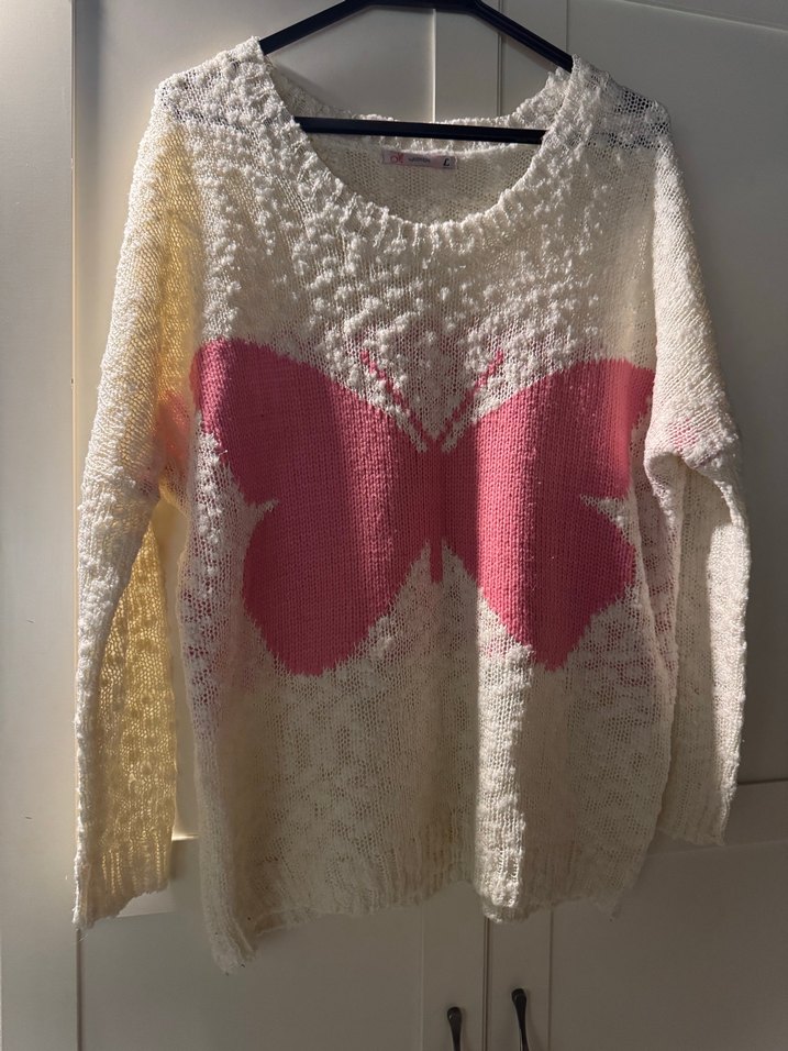 Uzun kollu, beyaz örgü kazak, önünde büyük pembe kelebek deseni bulunur. Bohem tarzda, rahat kesim ve yuvarlak yaka içerir.