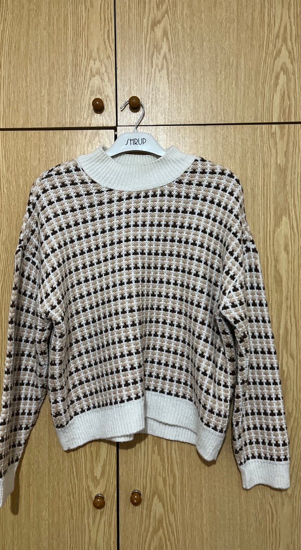 Uzun kollu, bol kesim kadın kazak, yuvarlak yaka ve kahverengi-gri kareli desene sahip örgü kumaştan üretilmiştir. Rahat ve şık bir görünüm sunar.