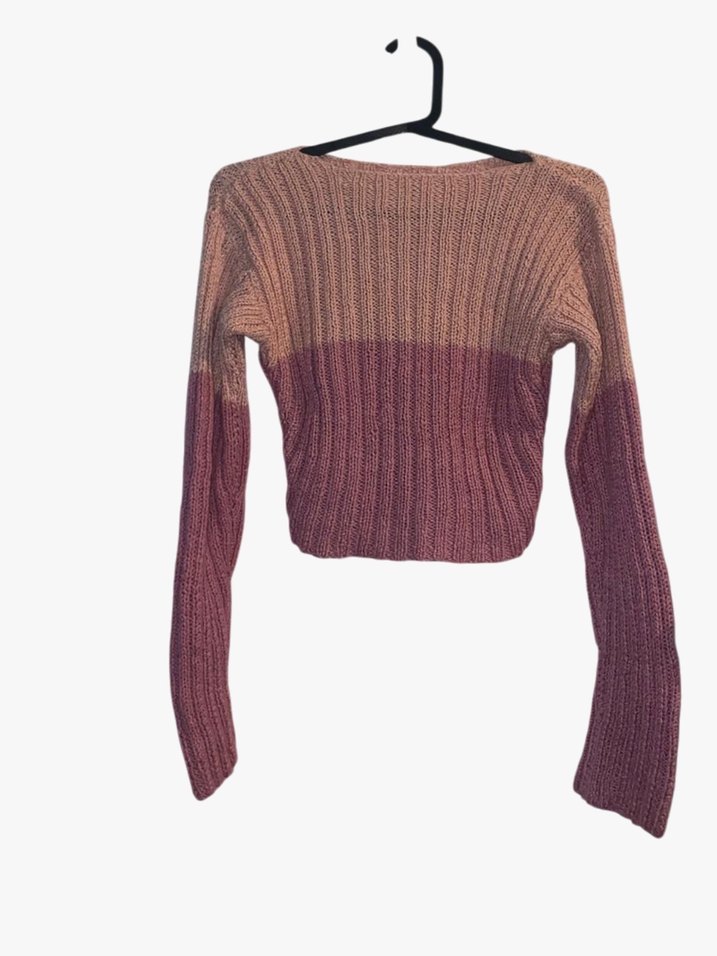 Pembe tonlarında, uzun kollu ve bisiklet yaka, örgü dokulu, günlük kullanıma uygun, vücuda oturan crop kadın kazak.