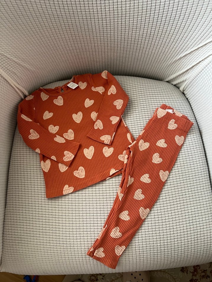 Koyu kahverengi kız bebek takımı, uzun kollu ve örgü dokulu kumaş üzerinde kalp desenleriyle rahatlık ve sıcaklık sağlar. ❤️