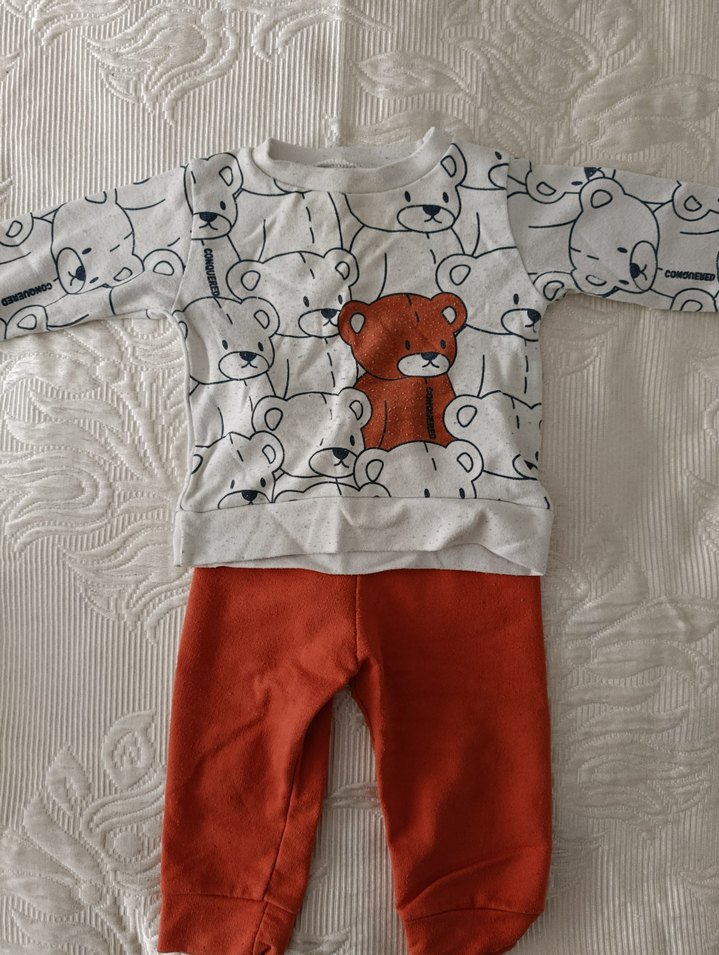 Uzun kollu, örme yakalı ve ayıcık desenli üst ile yumuşak dokulu kahverengi pantolondan oluşan bebek takımı.