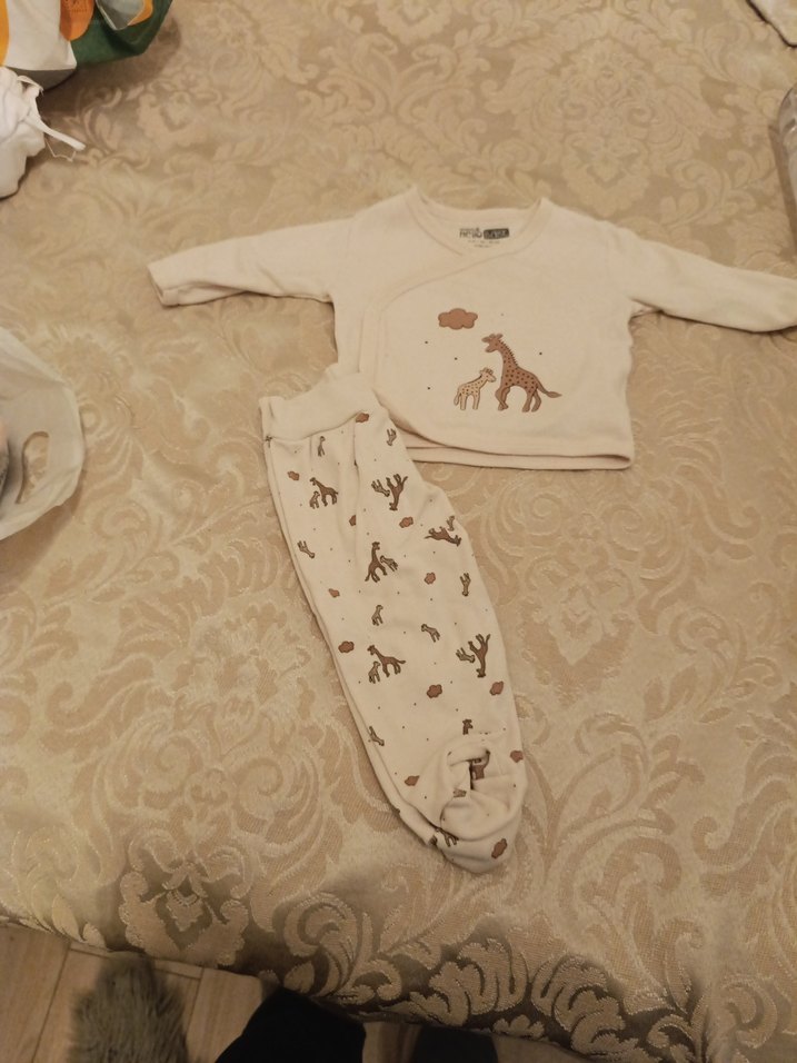Uzun kollu, örme dokulu ve baskılı zürafa desenli erkek bebek takımı, yumuşak ve sıcak kumaştan yapılmıştır.