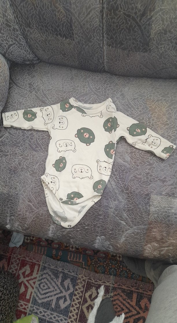 Bu gri bebek body, uzun kollu ve yuvarlak yakalı yumuşak, örme kumaştan üretilmiştir. Sevimli baskılı deseniyle sokak stili için uygundur.