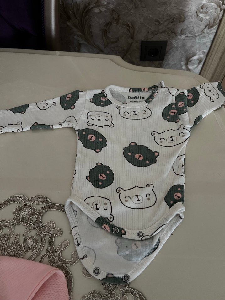 Uzun kollu, gri renkli örme bebek body, baskılı ayı yüzleri ve yuvarlak yakaya sahiptir. Yumuşak ve sıcak kumaşlıdır.