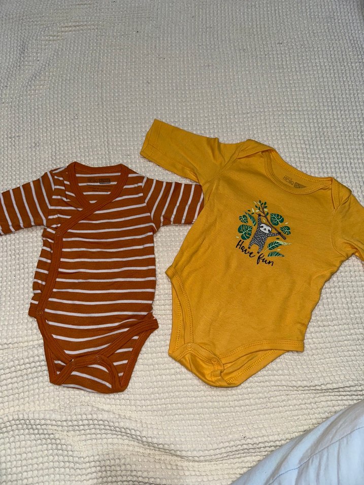 İki uzun kollu örme pamuklu bebek body seti, biri çizgili diğeri renkli doğa temalı baskılı, rahat yuvarlak yakalıdır.