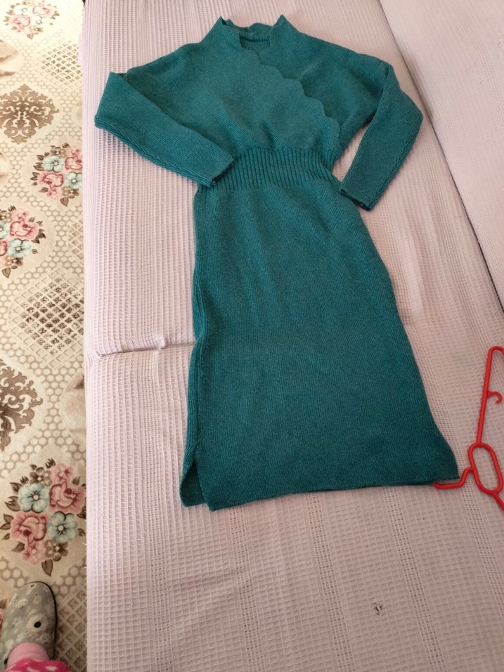Mavi renkli, uzun kollu, vücuda oturan örme yünden yapılmış kadın elbisesi. Rahat ve günlük kullanıma uygun tarzda.