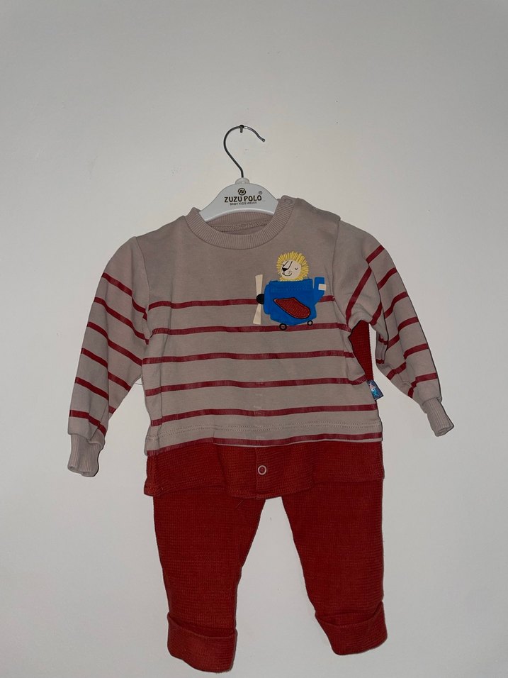 Uzun kollu, bisiklet yaka, örme dokulu alt ve kırmızı çizgili, kahverengi ve gri tonlarında streetwear tarzı erkek bebek takımı. Yumuşak ve sıcak kumaştan yapılmış eşofman altı dahildir.